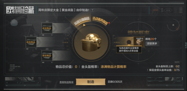 还有白银战盔、黄金战盔枪械挂饰体验卡、3-5级装备头盔、柯恩币等诸多奖励!制造时可选择添加欧特斯金矿,更能提升获得黄金战盔、白银战盔的概率!