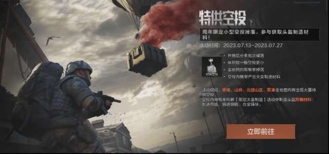 农场、山谷、北部山区、军港的全地图(包括封锁区和强化封锁区)内将出现大量的特供空投!空投内将概率产出限定大金制造活动中制造头盔所需材料:制造图纸、锻造钢板、合金铸块。