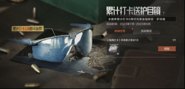 打卡送护目镜:S4赛季期间每周完成打卡即可获得兑换币,累计打卡6周即可兑换S4赛季限定服装–黑金指挥官·护目镜;