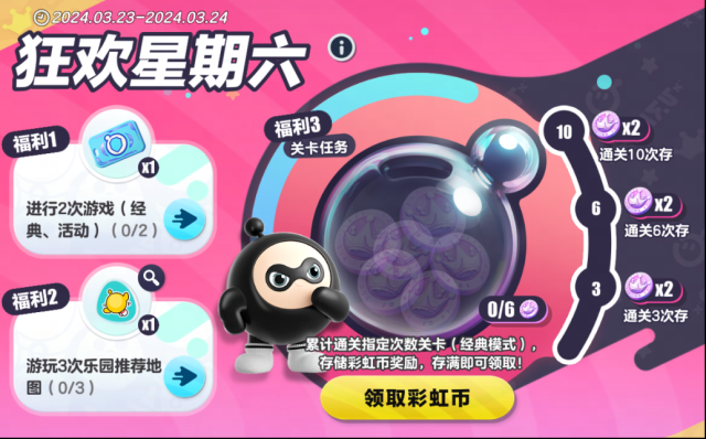 3月23日-3月24日狂欢星期六再度来袭免费获得萌趣动作 草原舞步 6枚彩虹币及巅峰派对保护卡*1