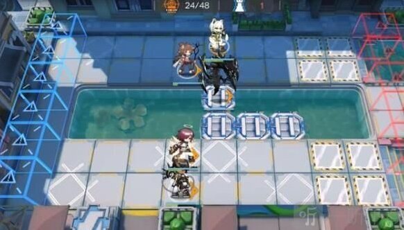 这一关难点较多,一个是两拨敌人潮不好搞定,这里考虑用4个干员来针对,开局先布置凯尔希,在第5格位置冲下攻击,先布置M3大哥冲上攻击,然后cost卡14点布置能天使冲右侧攻击。cost好了布置小绵羊,然后在中间水域的下方放3个平台,期间补个棘刺,上路的大力水手过来的时候马上开凯尔希技能搞定,马上撤掉M3,避免后续能天使过载对轴失败。
