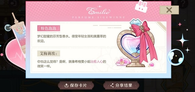 1、活动期间,完成来自艾梅莉埃的四道选香测试,并收下艾梅莉埃推荐的香水和香水说明卡,即可领取游戏内道具奖励。