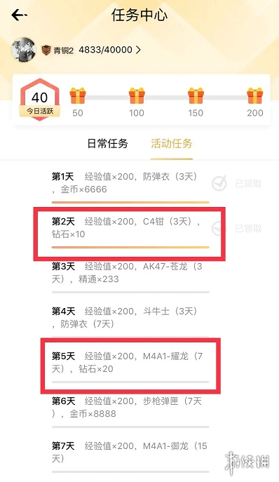 5、每天完成一些简单任务(标记为红框的任务),一个月累积可获得约600积分,其中400积分可用于兑换100钻石。