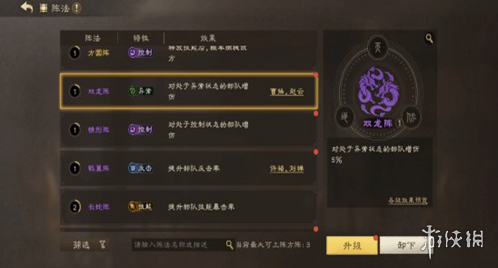 阵法选择直接关乎刘备战力的完全释放效果,天覆阵凭借技能触发治疗的特性,与刘备的主动治疗形成双重保障,特别适合需要长时间缠斗的消耗战,布阵时需注意激活桃园结义羁绊,这对反击体系的威力提升至关重要,而冲轭阵则是反攻利器,尤其适合搭配反击型主将,通过提升反击伤害将敌人的攻势转化为致命反噬,阵型特技的选择同样讲究策略,扩军增加容错率、护军强化防御根基、制动延缓敌方推进节奏、励军激发部队潜能,这些看似微小的属性加成,在持久战中往往能累积成压倒性优势。
